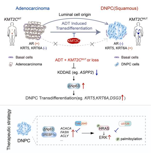 研究团队通过综合分析人类前列腺癌样本、基因编辑小鼠模型以及患者来源的类器官(PDOs),系统地研究了 KMT2C 缺陷对前列腺癌的影响。研究人员发现,KMT2C 基因突变或缺失的肿瘤在ADT后更容易转变为DNPC。KMT2C缺陷的DNPC主要源自腺泡细胞的转分化,而非基底细胞的恶性转化。此外,KMT2C缺陷通过破坏AR信号通路和增强ΔNp63依赖的转分化,驱动前列腺癌向DNPC转变。研究还揭示了 KMT2C 在维持脂肪酸合成中的关键作用。在 KMT2C 缺陷的DNPC中,脂肪酸合成通过ΔNp63介导的SREBP1c转激活得以维持,进而通过HRAS的棕榈酰化和MAPK信号通路激活促进DNPC的生长。